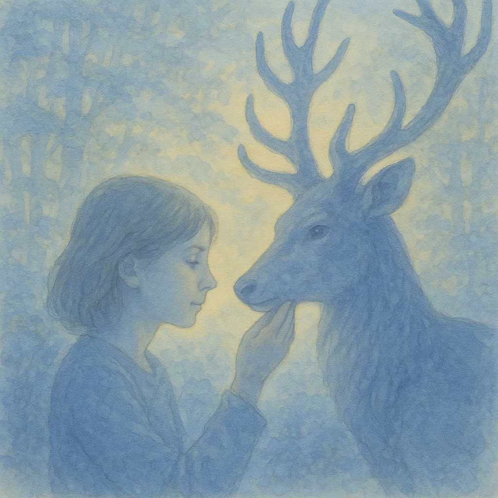 El ciervo la miró con ojos dulces y se quedó a hacerle compañía. Caminaron juntos durante un largo rato por el bosque hasta que de repente la niña quedó congelada en el sitio.